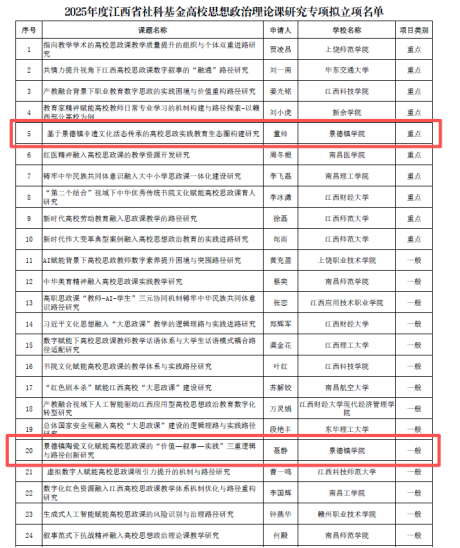 近日,2025年度江西省社会科学基金高校思想政治理论课研究专项立项结果正式公布。我校音乐舞蹈学院董帅获批重点项目、陶研中心聂静获批一般项目,获批数量取得新突破,亦是我校首次获批社科基金重点项目,标志着我校在思想政治理论课研究与学科建设方面迈上了新台阶。