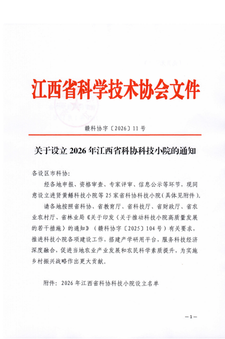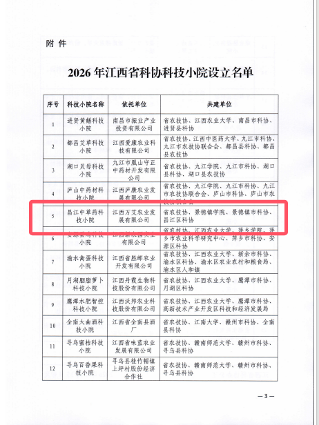(本网讯:生环学院)近日,江西省科协发布《关于设立2026年江西省科协小院的通知》(赣科协字〔2026〕11号,设立25家省科协科技小院,由我校联合江西省农技协、景德镇市科协、昌江区科协共建的“昌江中草药科技小院”成功入选,该小院是我校获批的第四个科技小院,这一成果标志着景德镇学院在农业科技创新与乡村振兴服务领域迈出了坚实步伐。
